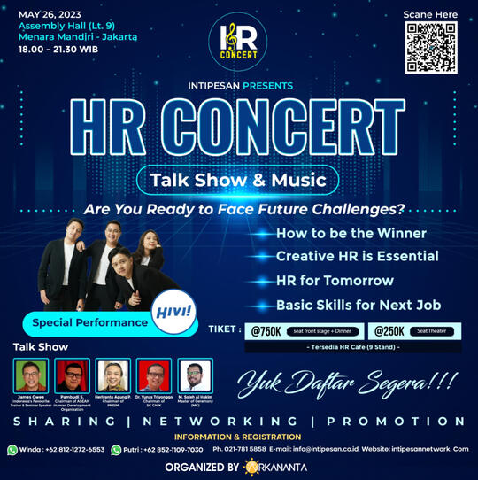 HR Concert 2023: Menghadapi Tantangan Masa DepanHR Concert 2023 akan segera hadir di Menara Mandiri pada tanggal 26 Mei 2023 dengan tema "Are you ready to face future challenges?". Acara ini akan membahas tantangan yang dihadapi oleh pengembangan sumber daya manusia di era digital saat ini dan cara mengatasinya. Acara ini akan dimeriahkan oleh bintang tamu HIVI! dan menawarkan kesempatan untuk berbagi, jaringan, dan promosi. (baca juga: mengenal lebih dekat tentang event organizer)Dalam acara ini, Anda akan mendengar pemaparan dari para ahli di bidang HR, termasuk James Gwee, Pambudi S, Heriyanto Agung, Dr. Yunus Triyonggo, dan M. Soleh Al Hakim. Mereka akan membahas topik-topik penting seperti "How to Be The Winner", "Creative HR is Essential", "HR for Tomorrow", dan "Basic Skills for the Next Job".Acara HR Concert 2023 adalah kesempatan yang sangat baik bagi para profesional di bidang HR untuk memperoleh informasi terbaru dan mengembangkan keterampilan mereka. Anda akan memperoleh pengetahuan yang berharga dan dapat memanfaatkannya untuk menghadapi tantangan masa depan.Jangan lewatkan kesempatan untuk bergabung dengan para ahli di bidang HR dan teman-teman sejawat lainnya di acara HR Concert 2023. Daftar sekarang dan siapkan diri Anda untuk menghadapi tantangan masa depan!